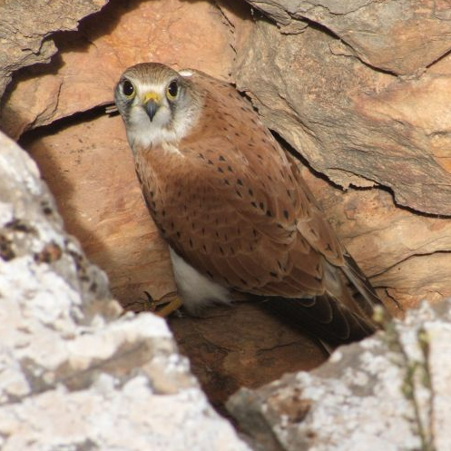 Kestrel hen guarding nest.